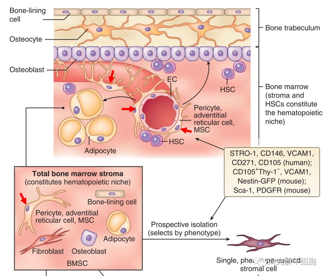 在生理上,MSCs位于血竇的外表面,血竇是骨髓中一種典型的血管類型 (紅色箭頭所指就是MSCs)。